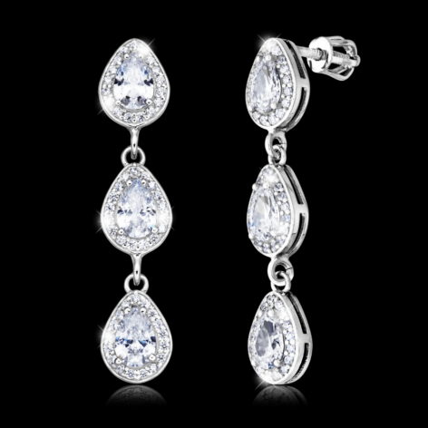 Výrazné, nádherné stříbrné náušnice o hmotnosti 4,50 g se 3 centrálními bílými (nebo na dotaz modrými) zirkony o průměru 4 x 7 mm, 17 bílými zirkony 1 mm kolem centrálního kamene na každé náušnici.