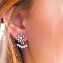 Každá stříbrná náušnice je osázena šesti zirkony o průměru 3mm a dalšími šesti o průměru 1,5mm. Design je navržen tak, že spodní závěs je umístěn za ucho, a tak je vytvořen originální efekt, podtrhující unikátní vyznění tohoto speciálního páru náušnic.