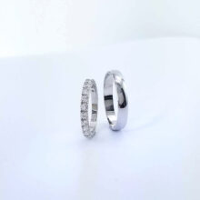 Krásný, oblíbený, luxusní a módní vzor snubních prstenů. Dámský prsten je ze dvou třetin osázen zirkony. Průměr kamenů koresponduje se šířkou prstenu. Pánský prsten je v čisté, elegantní hladké linii půlkulatého tvaru v šířce 4mm.