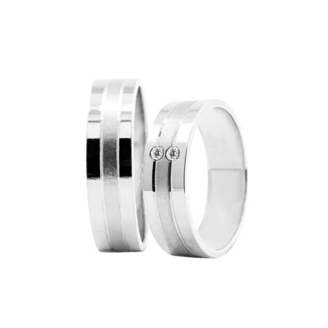 Snubní prsteny moderního designu, ploché provedení, doplněné dvěma drážkami, prostřední část je matová. Dámský prsten je osazen dvěma zirkony o průměru 1.5 mm. Pánský prsten je bez zirkonu.