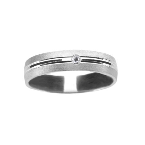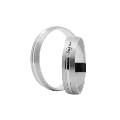 Moderní vzhled snubních prstenů v lehce půlkulaté provedení. Prsten je doplněný dvěma drážkami, krajní části jsou matové, prostřední část je lesklá. Dámský prsten je doplněný kamínkem.