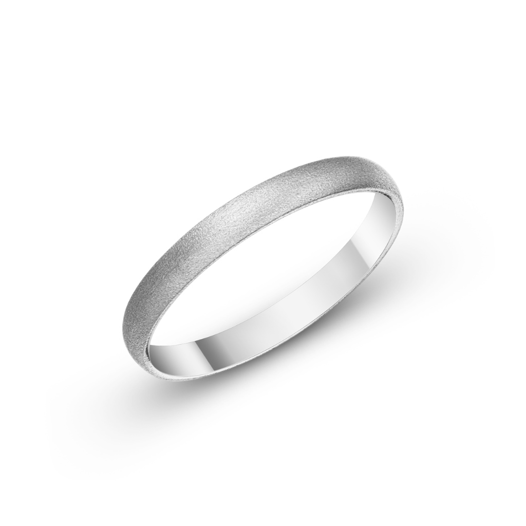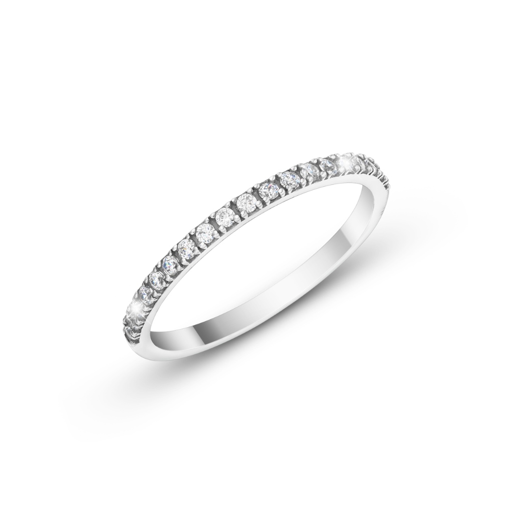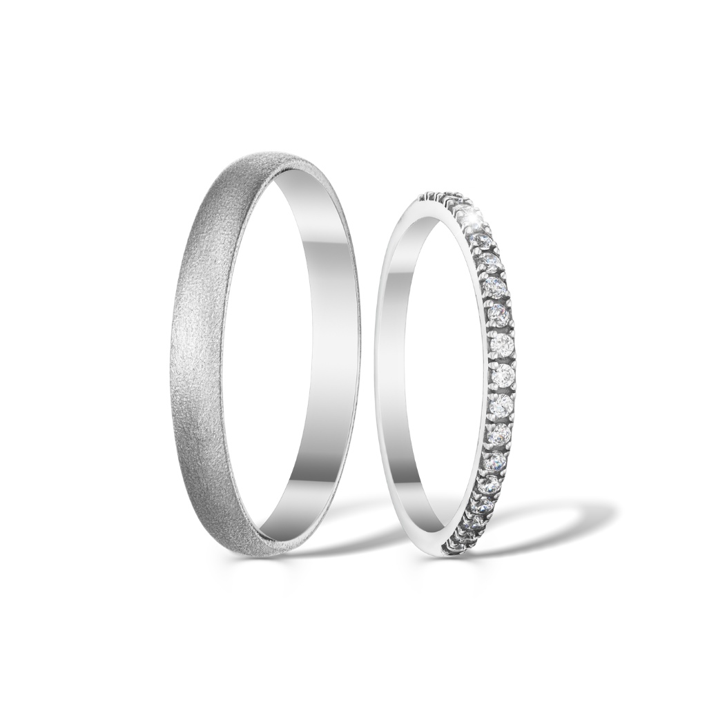 Luxusní a módní vzor snubních prstenů. Dámský prsten je z poloviny osázen zirkony o průměru 1,3 mm. Průměr kamenů koresponduje se šířkou prstenu. Pánský prsten je v čisté, elegantní hladké linii, v půlkulatém matném provedení v šířce 3mm.