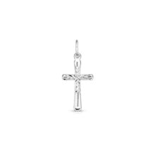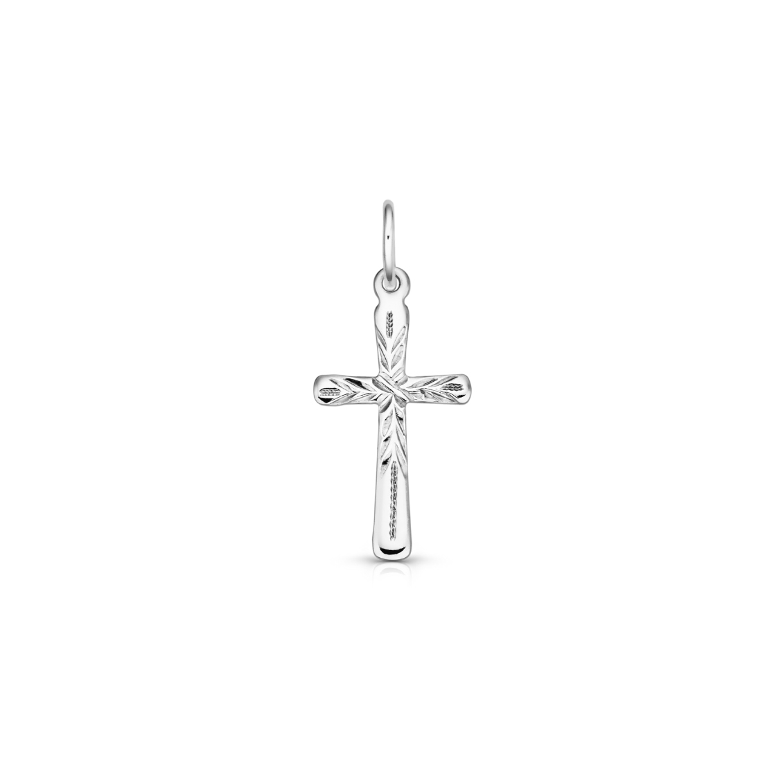 Drobný stříbrný přívěsek ve tvaru křížku, s povrchem zdobeným jemným rytím a zaoblenými rohy pro pohodlné nošení.