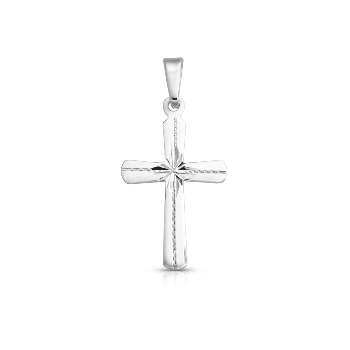 Stříbrný přívěsek – drobný křížek klasického tvaru se zaoblenými kraji, zdobený jemnou rytinou.