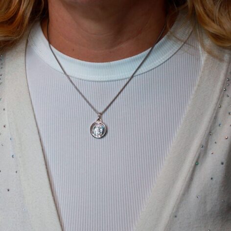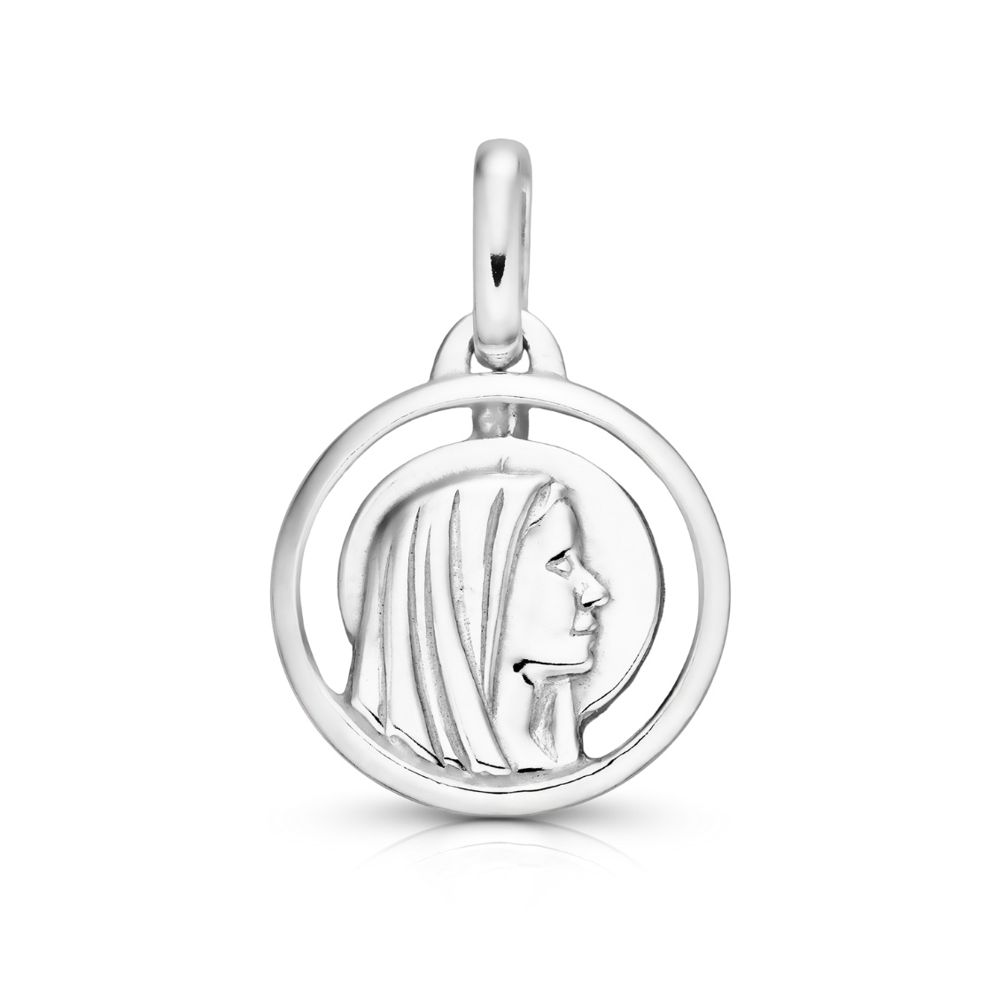 Stříbrný přívěsek znázorňuje portrét panny Marie se svatozáží umístěný v kruhu.