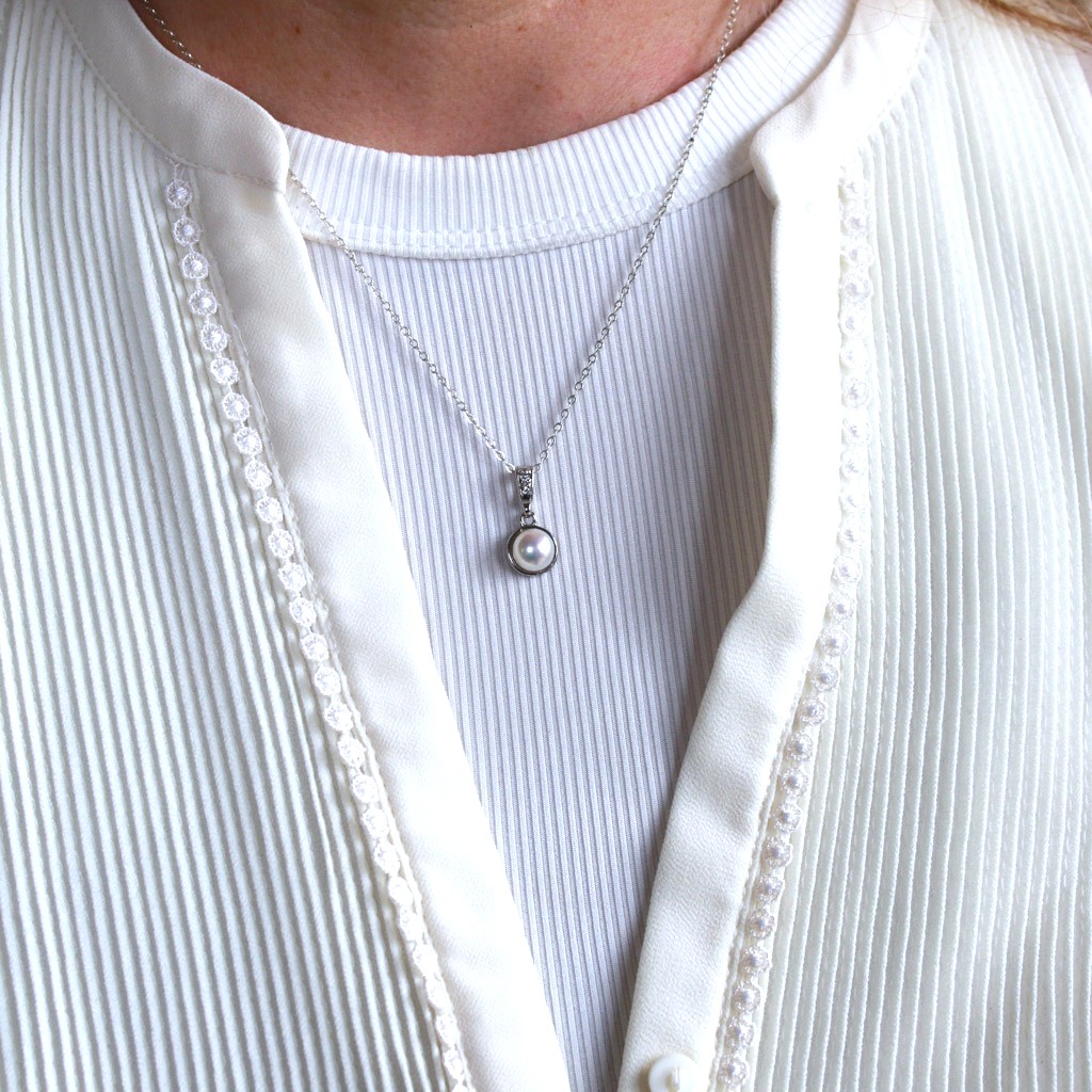 Stříbrný přívěšek s přírodní sladkovodní perlou o průměru 7 mm.