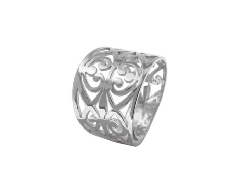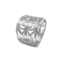 Výrazný, stále však elegantní stříbrný prsten, který svým designem připomene slavné dny art deca, ovšem zahalené do moderního kabátu.
