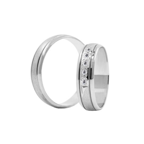 Pár snubních prstenů půlkulatého tvaru. Doplněné ruční rytinou, která u dámského prstenu ohraničuje vsazené zirkony. Pánský prsten je bez kamenů. Díky půlkulatému tvaru se prsteny dobře nosí.