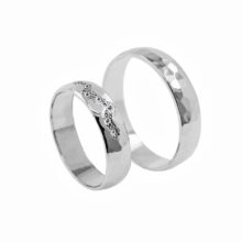 Moderní vzhled snubních prstenů v lehce půlkulaté provedení. Prsteny mají speciální povrchovou úpravu – jsou ručně tepané. To jim dodává punc originality. Dámský prsten je doplněný sedmi brilianty č zirkony dle přání zákazníka.
