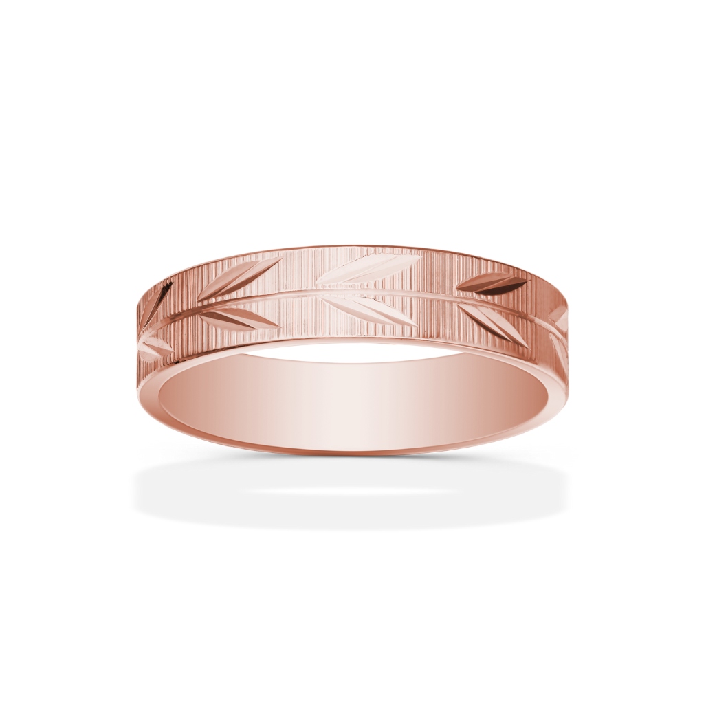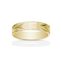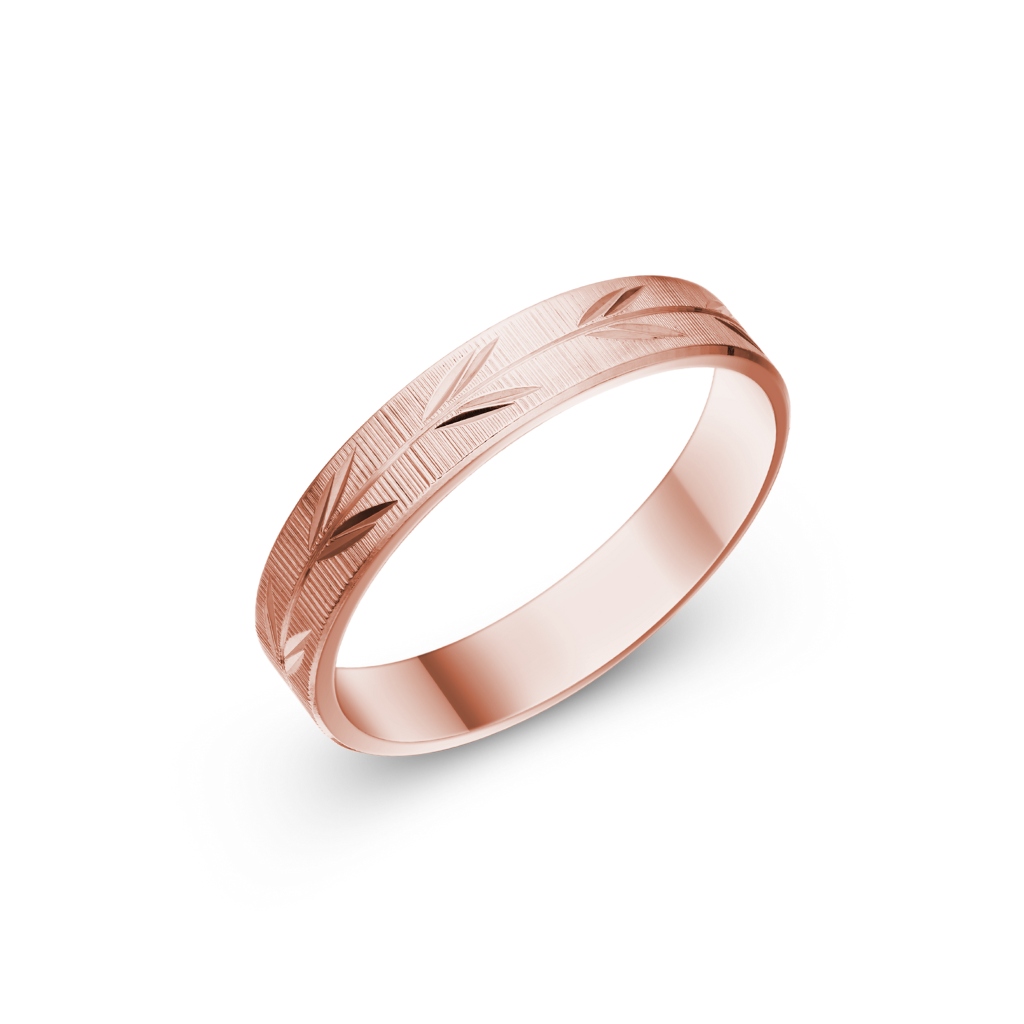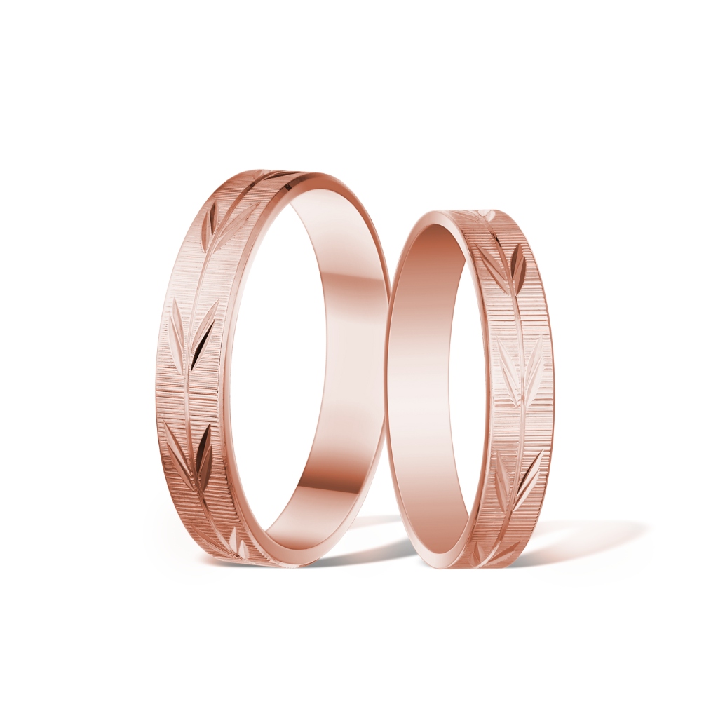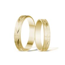 Minimalisticé zlaté snubní prsteny s posaluxovou úpravou a s jemnou rytinou. Dámský i pánský prsten ve stejném designu – moderní pojetí přírodního motivu.