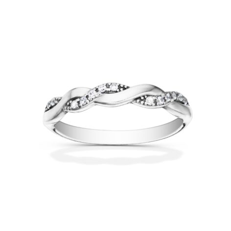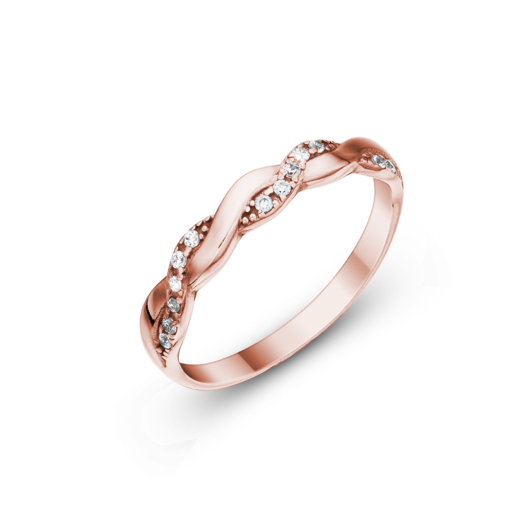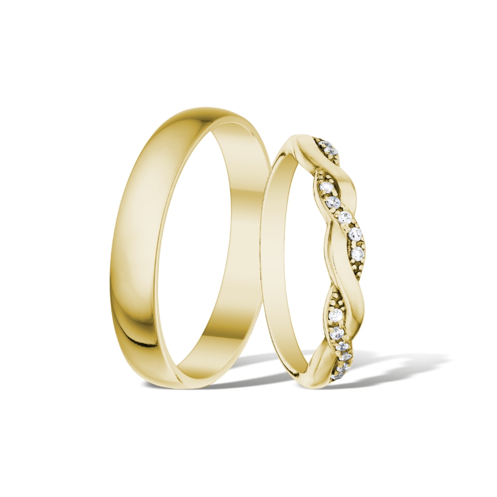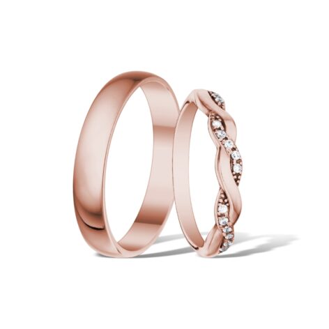 Krásný, elegantní a módní vzor snubních prstenů. Dámský prsten je v horní polovině „spleten“, přičemž jeden z pramenů je ozdoben drobnými třpytivými zirkony. Pánský prsten je v čisté, nadčasové hladké linii půlkulatého tvaru.