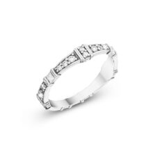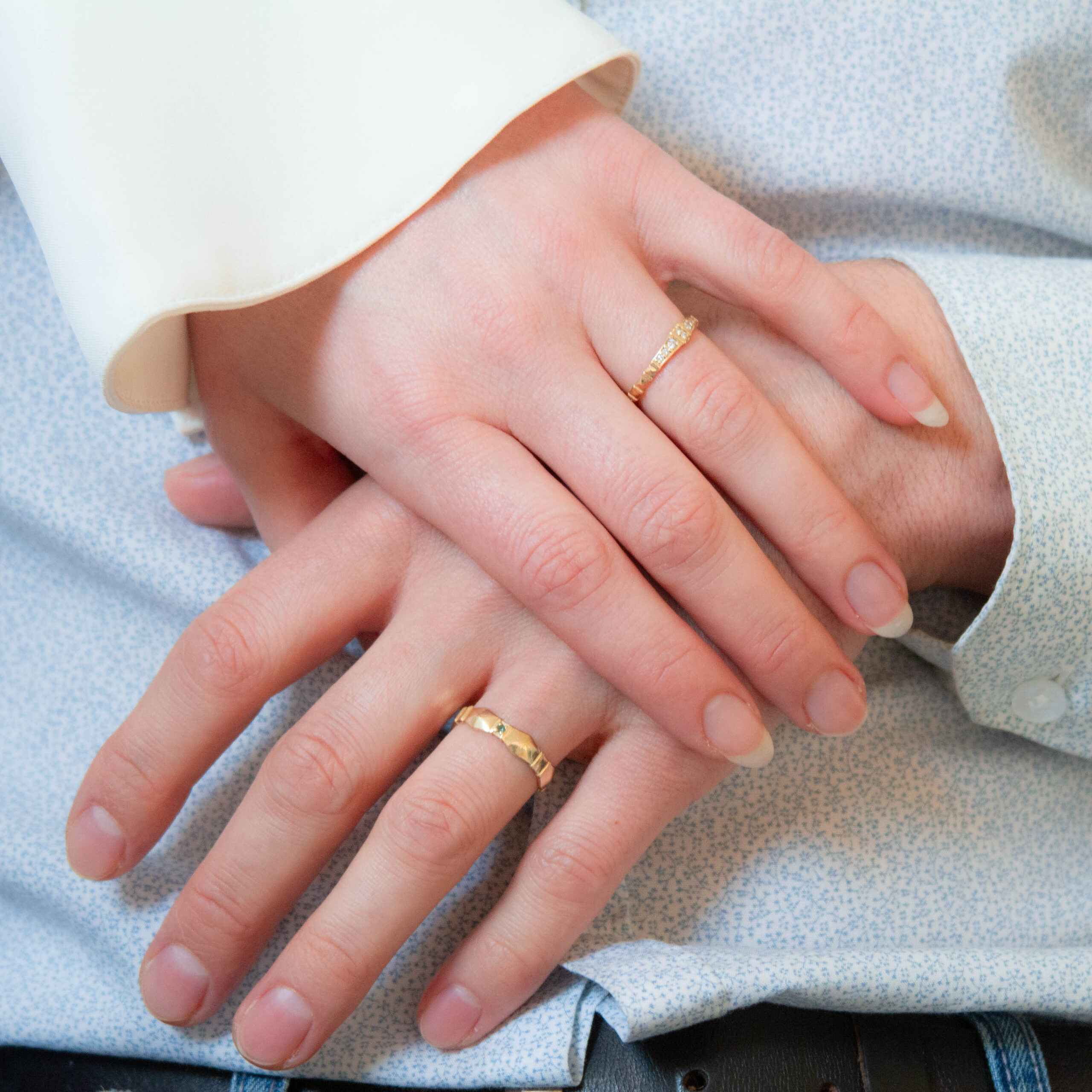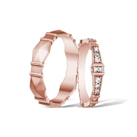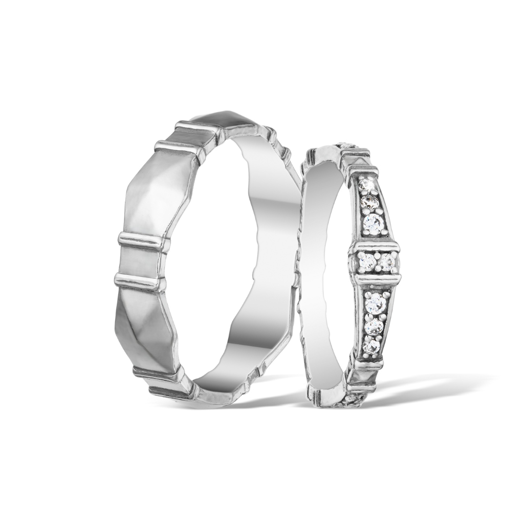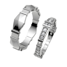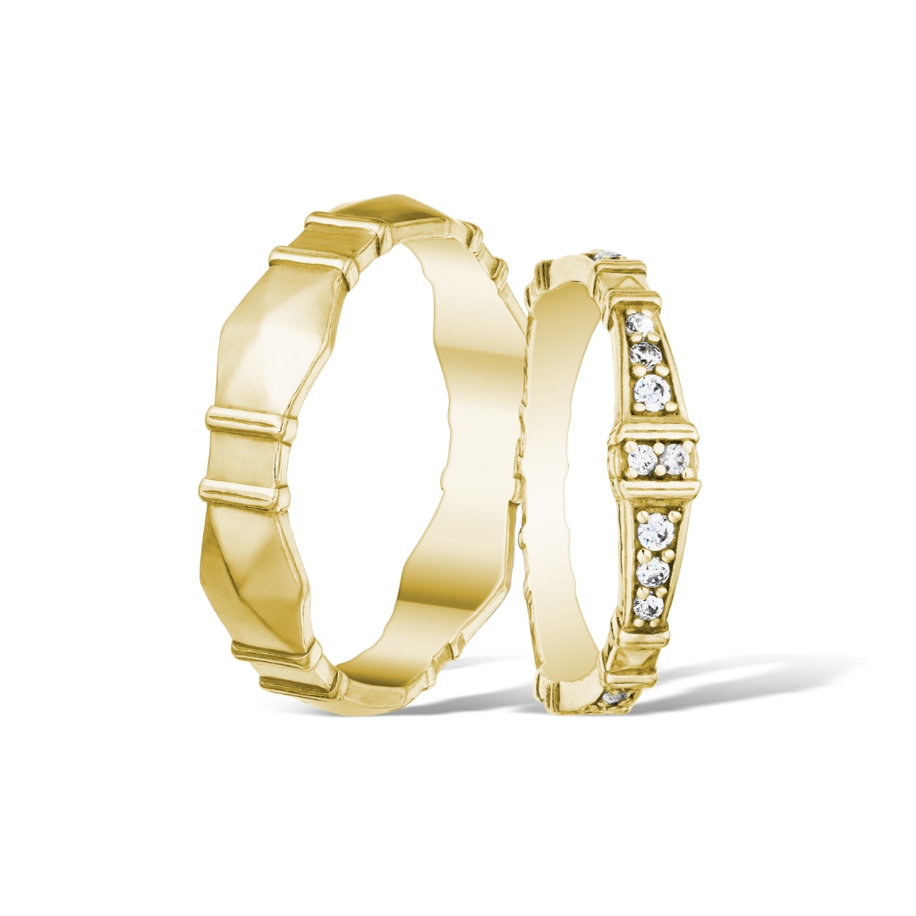 Pár zlatých snubních prstenů výjimečného vzhledu, s designem inspirovaným stylem art deco, převedeným do moderní podoby. Pánský prsten je bez kamenů, dámský je po délce ozdoben třpytivými zirkony. Na Vaše přání můžeme prsten osadit brilianty s certifikátem pravosti. Cena se dále odvíjí dle ceny briliantů.