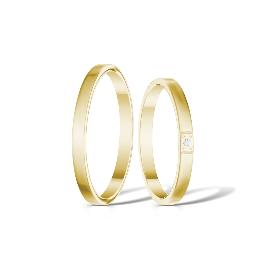 Krásný, oblíbený, luxusní a módní vzor snubních prstenů. Dámský prsten je osazen zirkonem o průměru 1,3 mm nebo je možno dle Vašich požadavků osadit certifikovaný briliant. Pánský prsten je bez kamenů. Prstýnky jsou v plochém provedení.