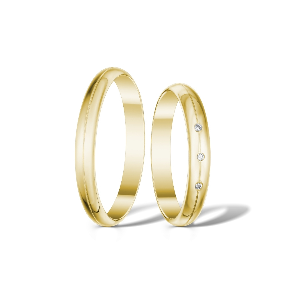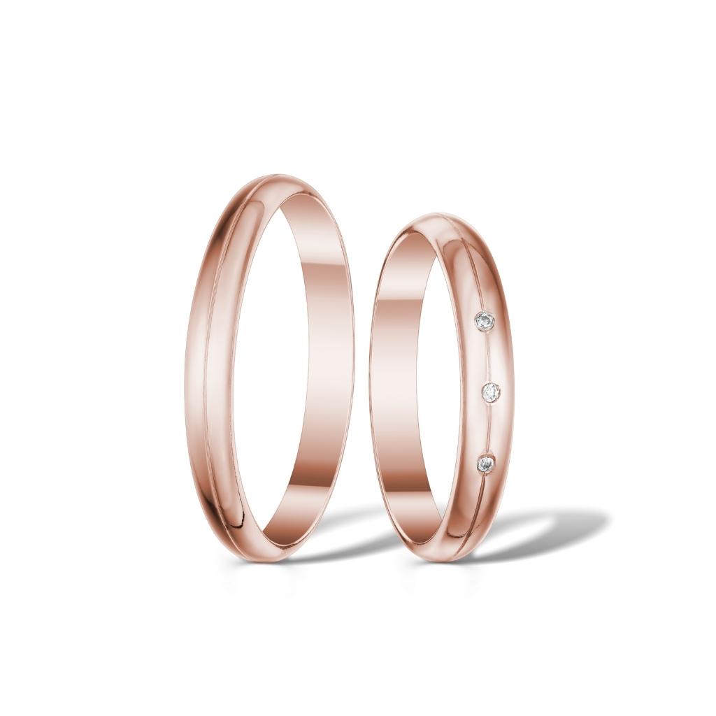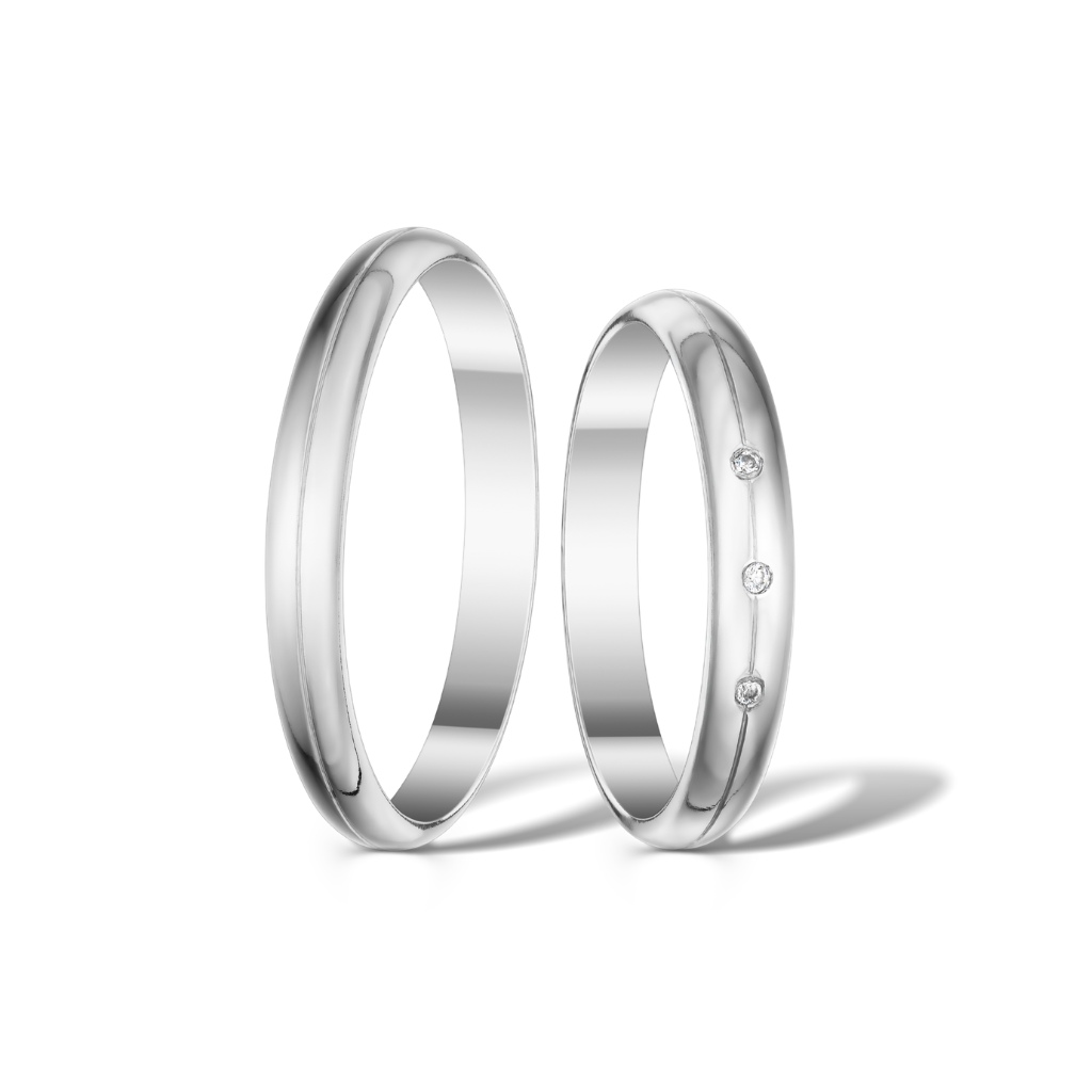 Krásné půlkulaté snubní prsteny ve vysokém lesku. Dámská varianta je doplněna 3 zirkony o průměru 1,3 mm. Pánský prsten je bez kamenů.