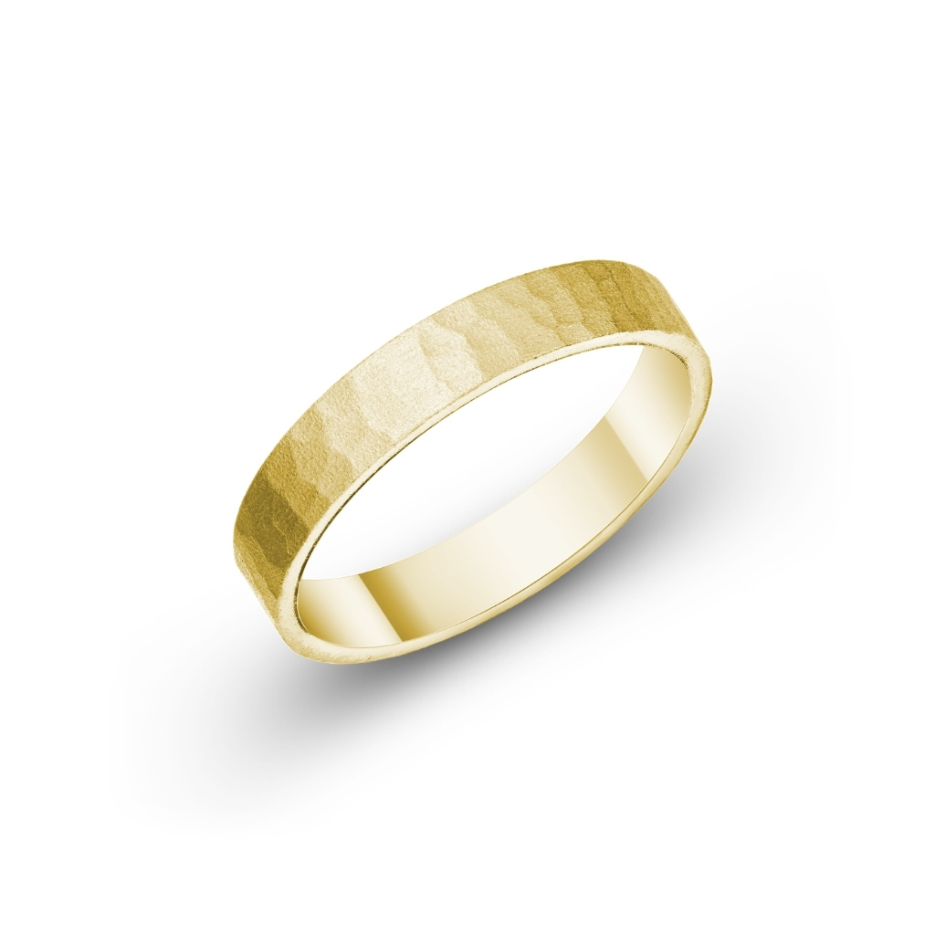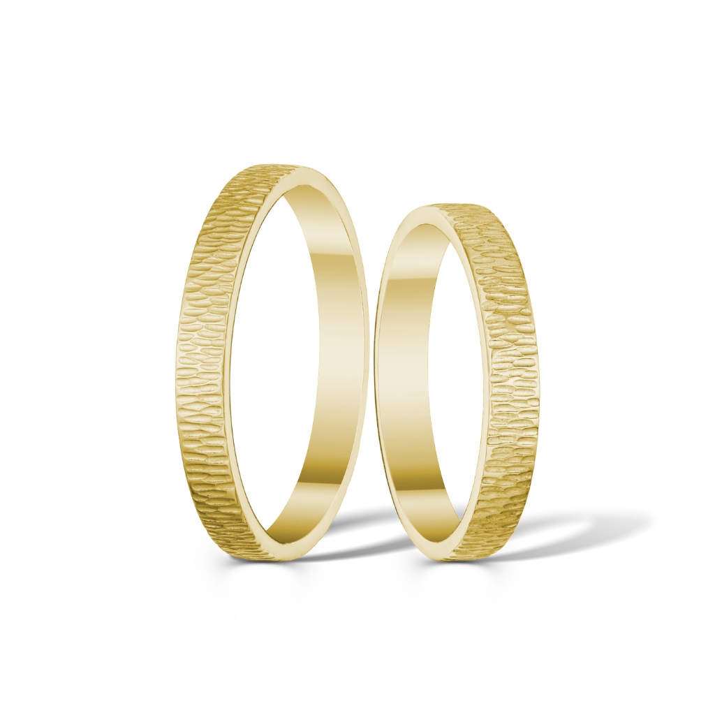 Ručně tepané jedinečné snubní prsteny v šířce 3 mm. Oba prsteny jsou unikátní ruční výrobou, v matném provedení zhotovené v naší zlatnické dílně v Jablonci nad Nisou. Prsteny jsou vyrobené ze 14 karátového zlata ryzosti 585/1000.