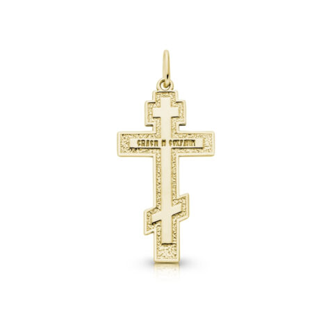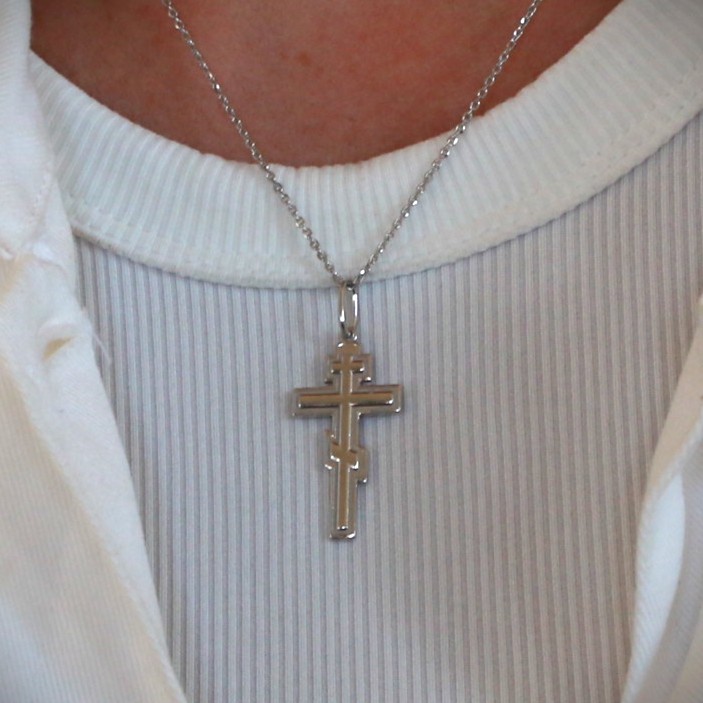Pravoslavný kříž (často osmiramenný) symbolizuje Kristovo utrpení, vítězství nad zlem a ochranu před zlem. Tři vodorovná ramena reprezentují nápis INRI (horní), Kristovy ruce (prostřední) a podnožku (dolní), přičemž naklonění dolní části naznačuje kajícího lotra vpravo a zatraceného vlevo. Často bývá doplněn o lebku (Adama) u paty.